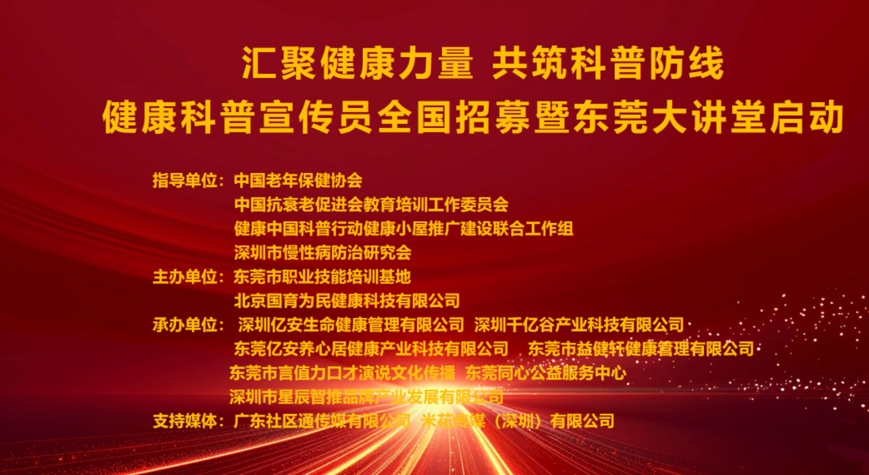 2025年11月15日下午,由深圳市慢性病防治研究会作为指导单位的“汇聚健康力量 共筑科普防线” 健康科普宣传员全国招募暨东莞大讲堂启动大会在东莞东城千亿谷基地成功举办。 详细